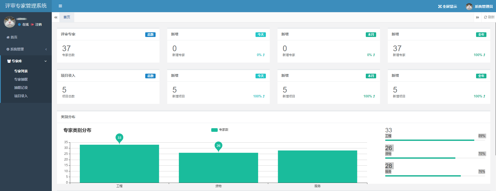 6、數(shù)據(jù)統(tǒng)計(jì):項(xiàng)目數(shù)量統(tǒng)計(jì)、專(zhuān)家抽取次數(shù)統(tǒng)計(jì)(按專(zhuān)家類(lèi)別、區(qū)域、內(nèi)外分別統(tǒng)計(jì))。