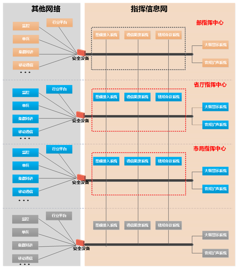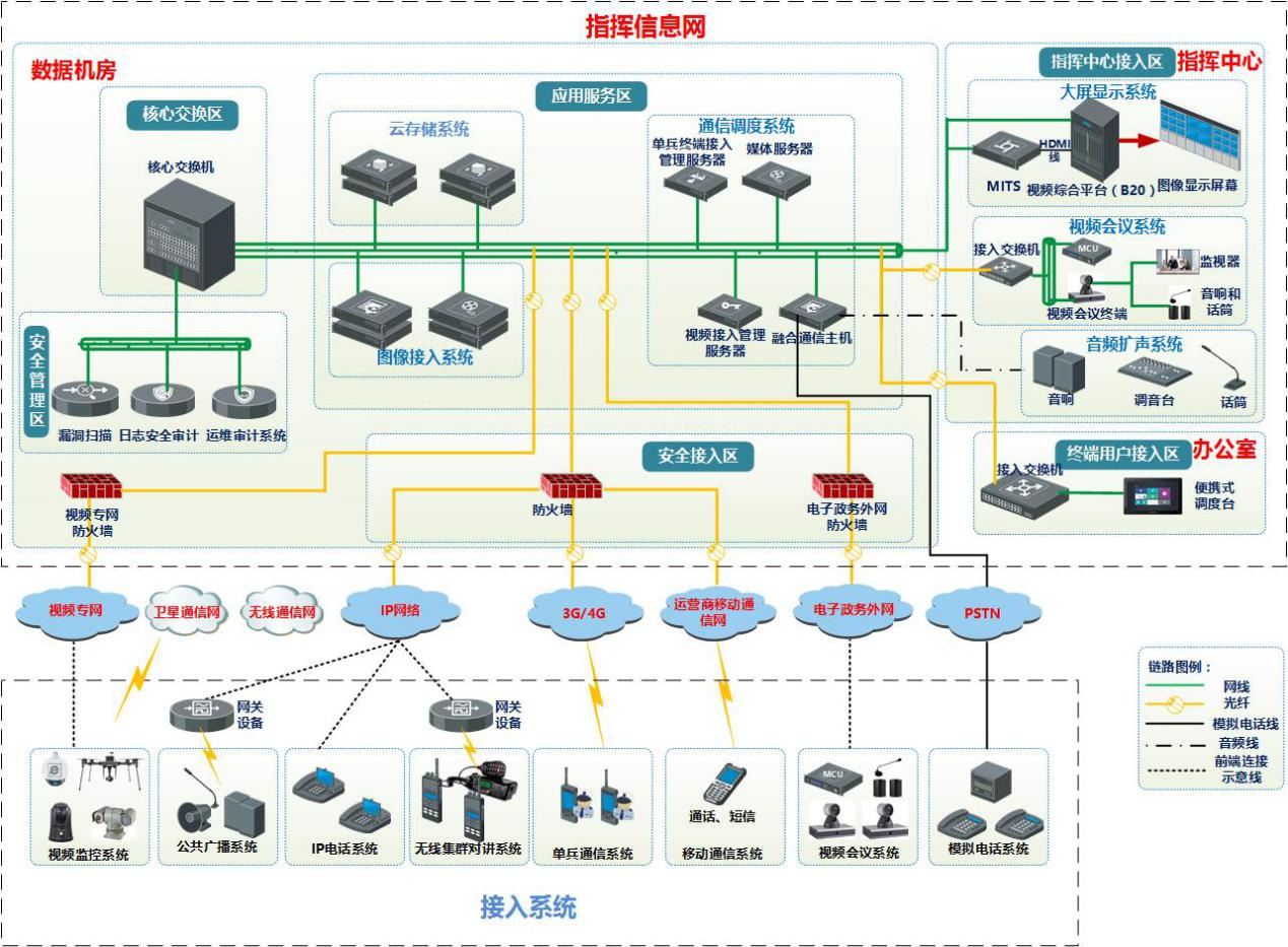 指揮中心的圖像接入系統(tǒng)、通信調(diào)度系統(tǒng)、視頻會議系統(tǒng)均可以單獨工作,并且能夠?qū)崿F(xiàn)部、省、市、縣聯(lián)網(wǎng)。其中在省/市等部門指揮中心,圖像接入系統(tǒng)、通信調(diào)度系統(tǒng)、視頻會議系統(tǒng)之間以及與大屏顯示系統(tǒng)及音頻擴聲系統(tǒng)之間根據(jù)業(yè)務(wù)需要進行系統(tǒng)對接。在無線通信網(wǎng)、電子政務(wù)外網(wǎng)、衛(wèi)星通信網(wǎng)上的各類視頻、音頻、數(shù)據(jù)采集類設(shè)備或者行業(yè)平臺,通過安全設(shè)備接入指揮信息網(wǎng),實現(xiàn)與圖像接入系統(tǒng)、通信調(diào)度系統(tǒng)等對接。業(yè)務(wù)架構(gòu)示意圖如下: