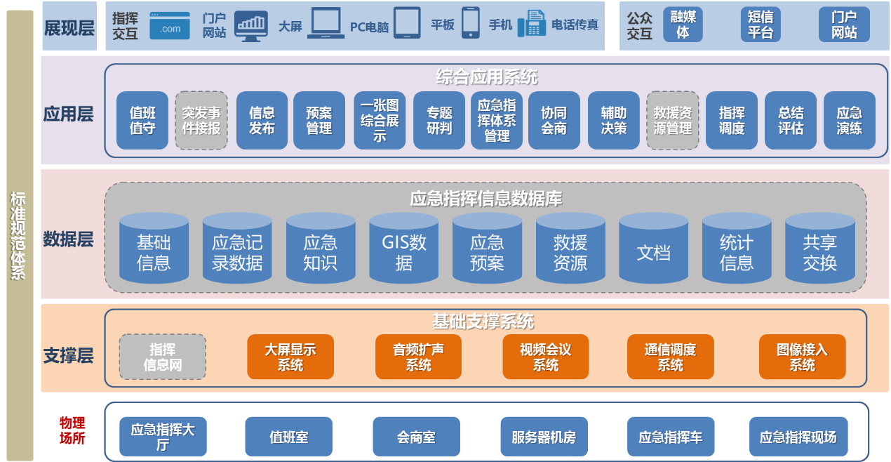 系統(tǒng)設(shè)計參照應(yīng)急管理部發(fā)布的應(yīng)急指揮信息系統(tǒng)建設(shè)任務(wù),整體架構(gòu)如下,包括支撐層、數(shù)據(jù)層、應(yīng)用層、展現(xiàn)層。